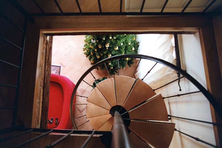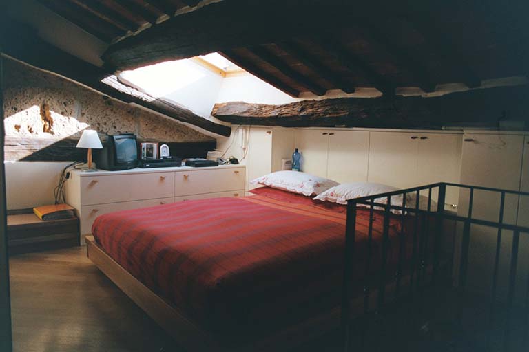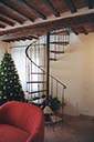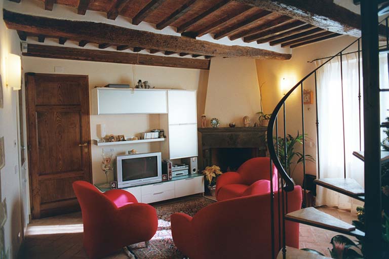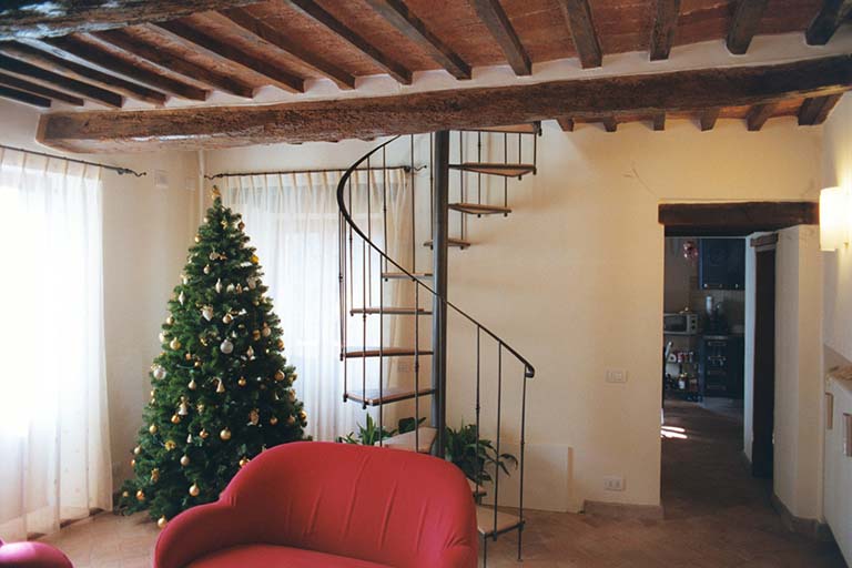 Apartment loft in the heart of the old town of Pitigliano. The spiral staircase in steel and brick characterizes the small space of the living room.