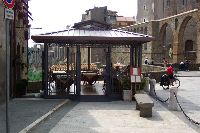 Quando si arriva all’ingresso del centro storico di Pitigliano, sulla sinistra si nota subito l’albergo Guastini ormai famoso negli anni, e subito nelle porte successive c’è il ristorante dell’omonima famiglia che ha voluto realizzare questo gazebo per poter ospitare le persone che vengono nella città del tufo e ammirano l’acquedotto mediceo naturalmente accompagnati da piatti tipici della cucina toscana.