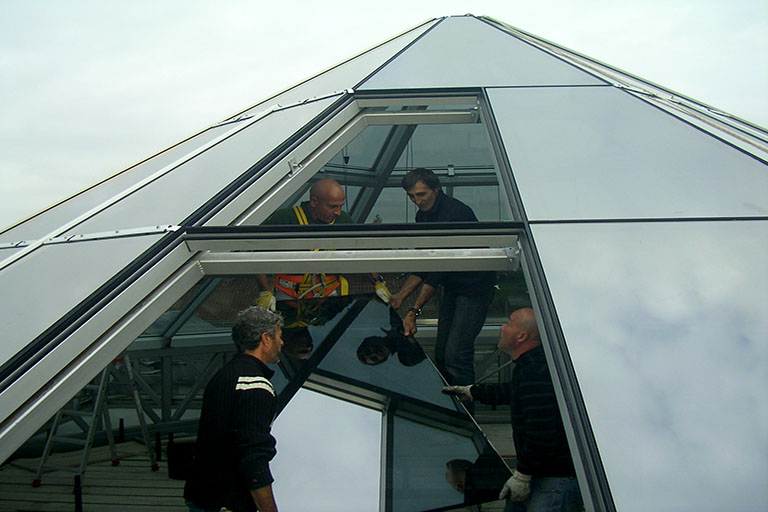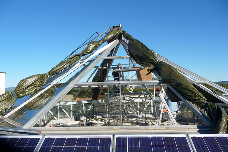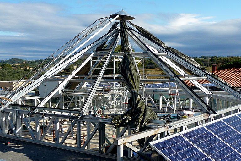 Gli interventi eseguiti nella sede centrale della Banca di Credito Cooperativo di Pitigliano sono stati realizzati al fine di ottenere un miglioramento nelle prestazioni energetiche dell’edificio. In particolare è stato eseguito il cappotto esterno su tutte le facciate (tranne quella a nord dove è posizionato l’ingresso alla sede) per via della struttura architettonica (realizzata quasi completamente da vetrate e parti in alluminio) e rifatto il lucernaio centrale a piramide, sostituendo le vetrate con dei materiali più performanti. Infatti dall’analisi completa dell’edificio le pareti esterne ed il lucernario centrale erano le zone più critiche dal punto di vista termico. Grazie agli interventi eseguiti le condizioni climatiche interne sono nettamente migliorate.Inoltre è stato eseguito un restiling delle facciate, ispirandosi a delle colorazioni più vicine ai colori sociali della banca.